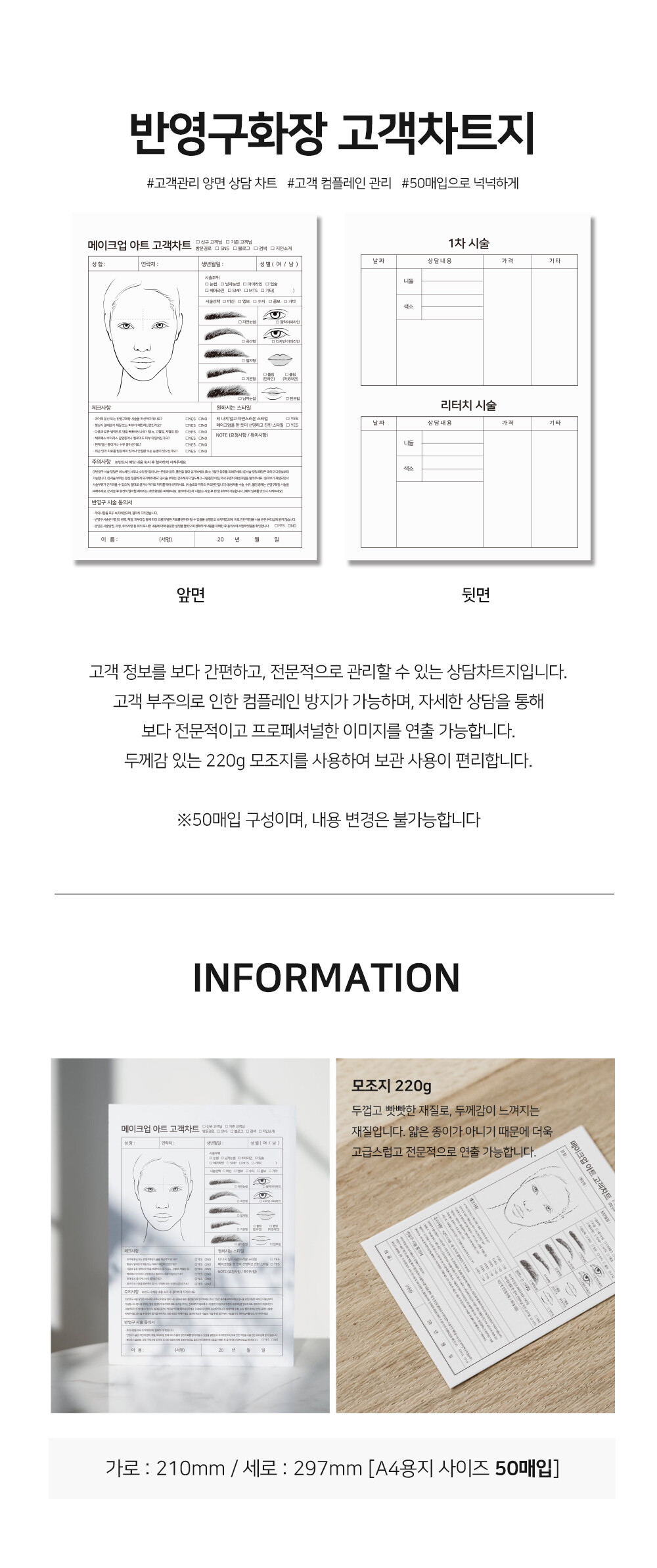 반영구화장 고객 차트 양면 50매입 고객 관리 시술 동의서 A4 두꺼운 모조지